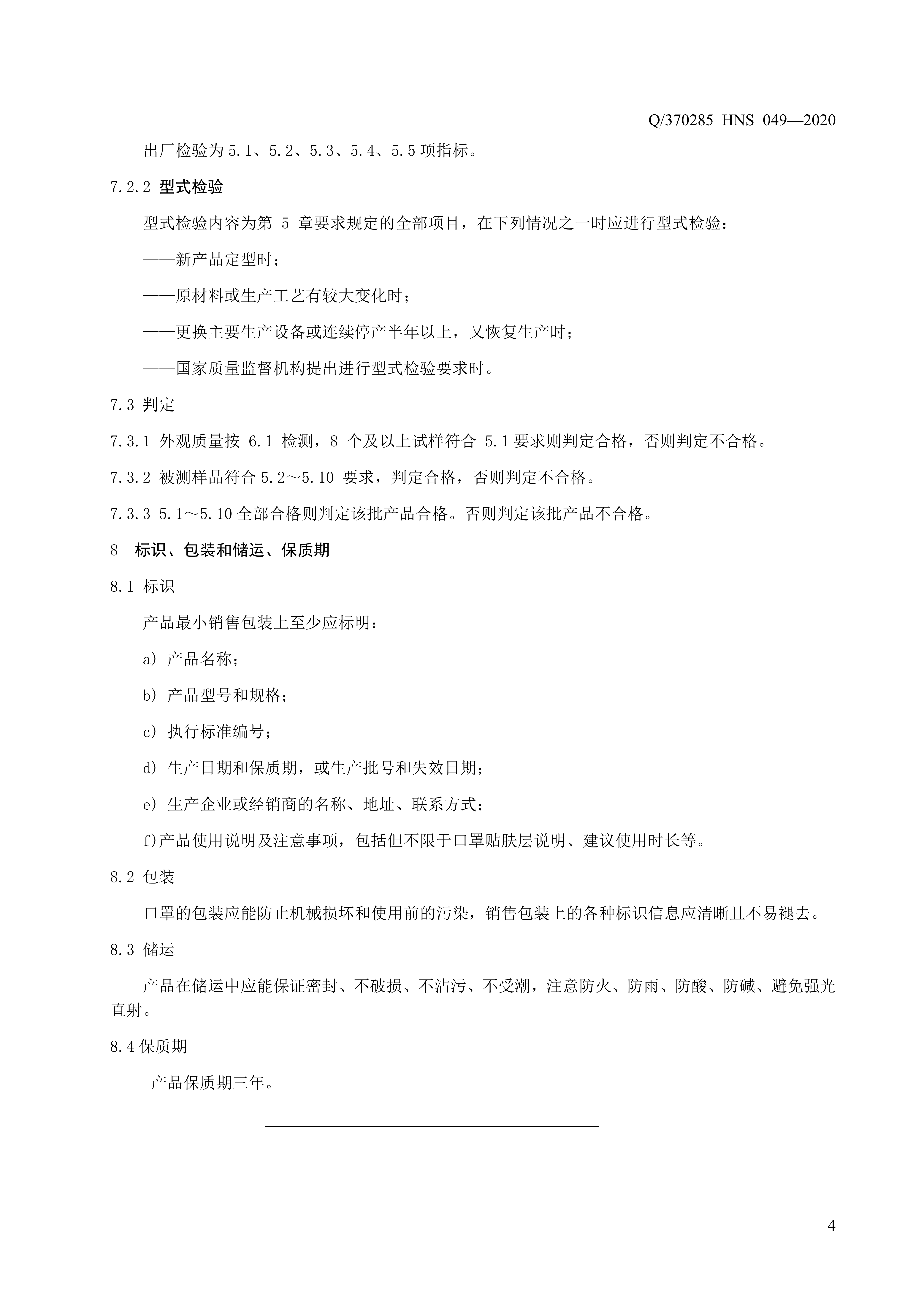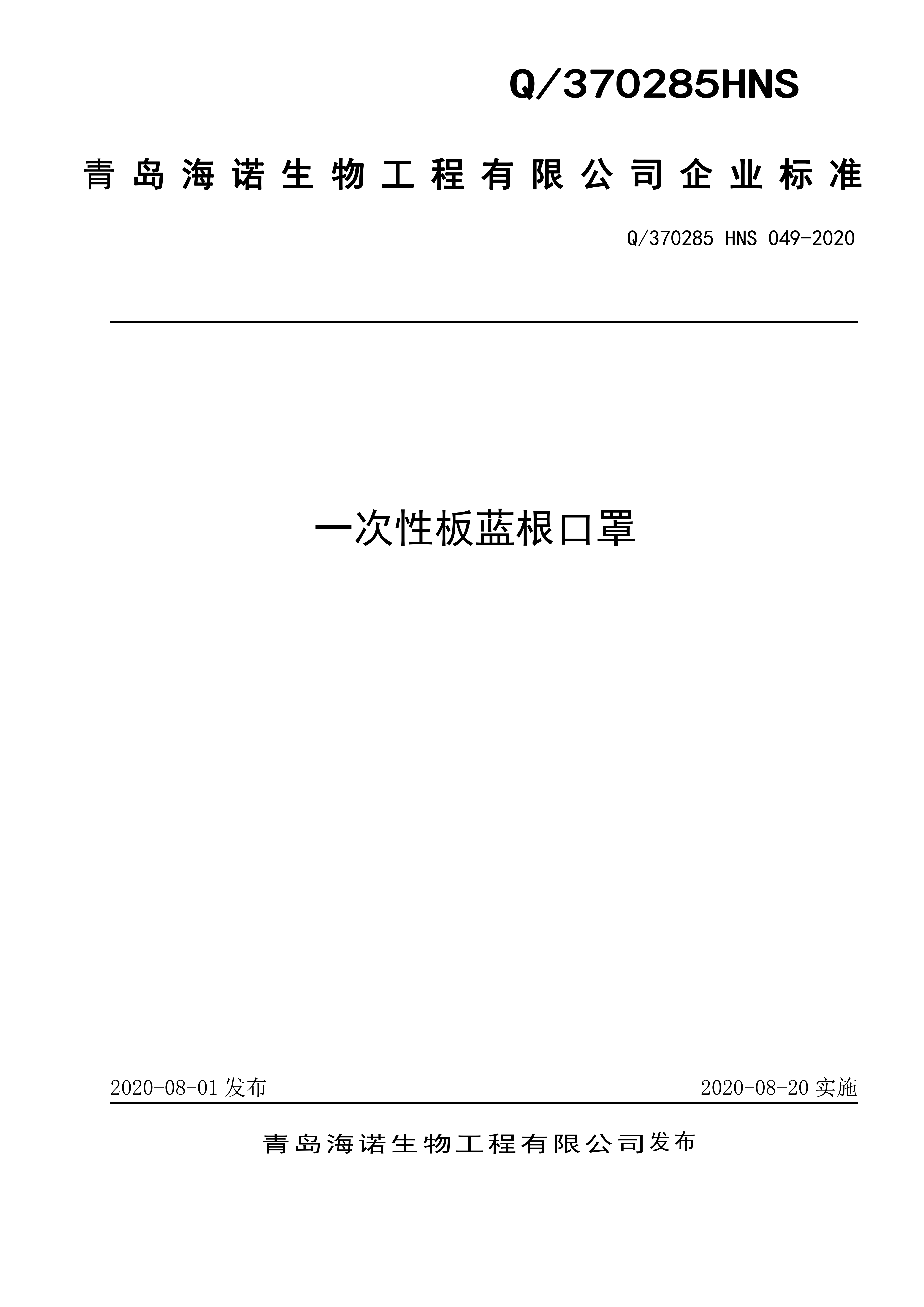 青島海諾生物工程有限公司企業(yè)標(biāo)準(zhǔn) — 一次性板藍根口罩