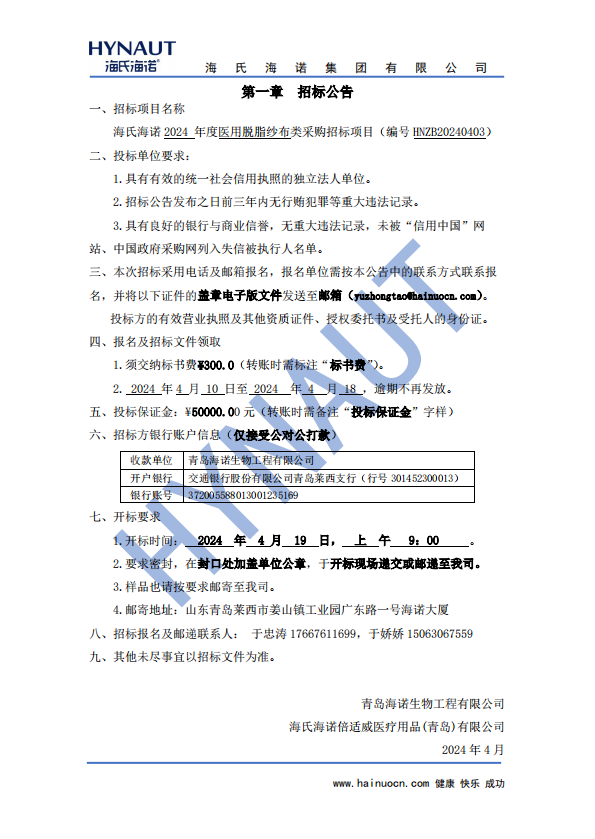 海氏海諾醫(yī)用脫脂紗布類采購項目招標公告